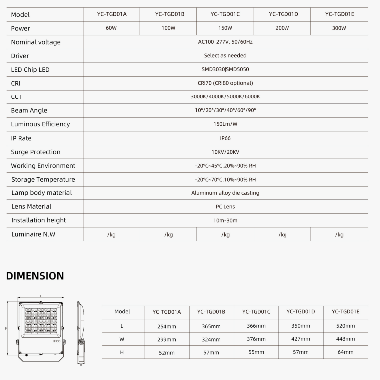 | YC-TGD01-50W | 358*294*52 | 50w | Heat sink Aluminum body,Glass,Bracket,304 screws, PCB، LENS. |